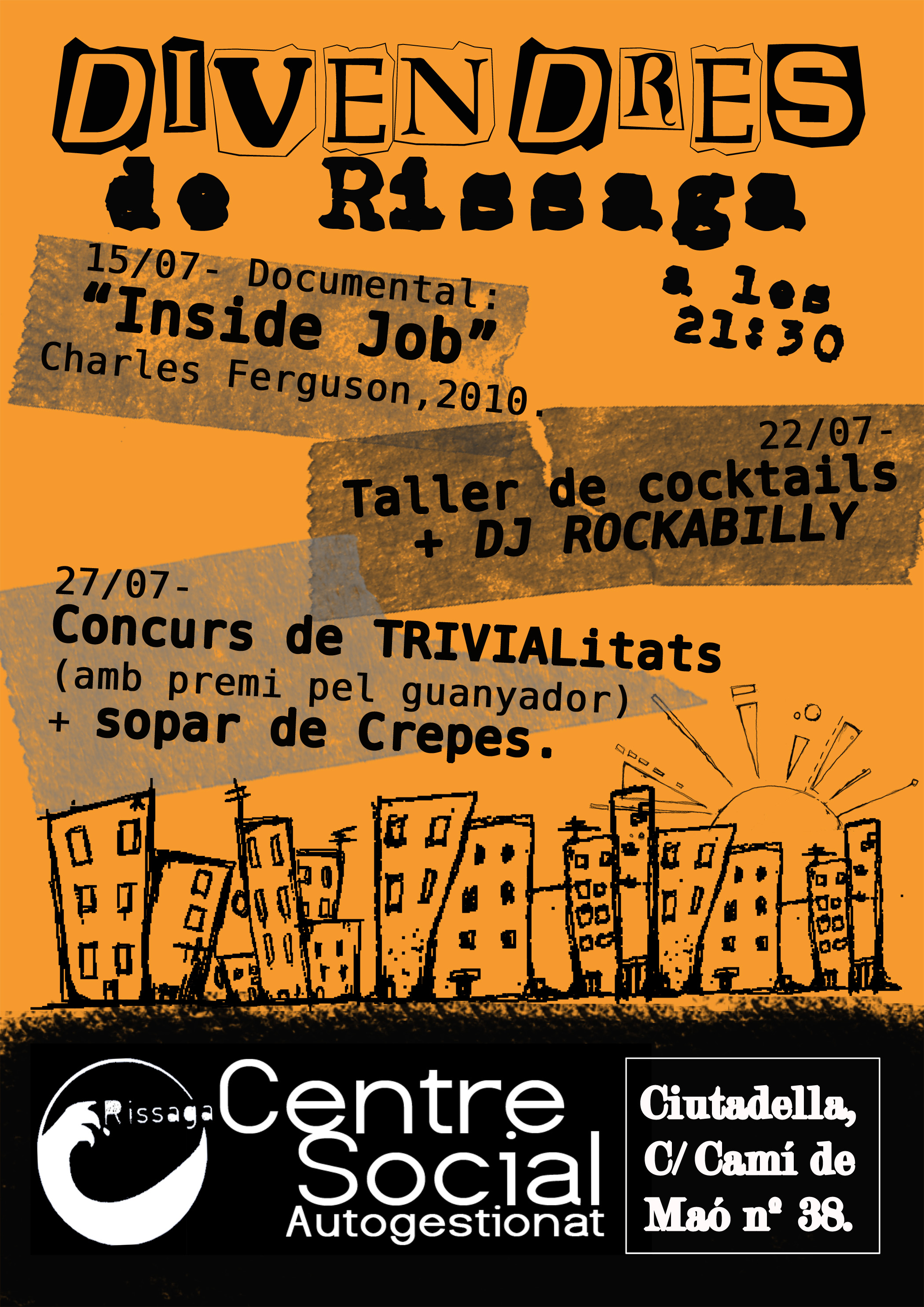 Des del Col·lectiu Rissaga teníem molt clar que un dels objectius fonamentals per tal de poder dur a terme el projecte d’un Centre Social Autogestionat a Ciutadella era el fet d’aconseguir un local, un lloc físic, de trobada, participació i llibertat. Un espai on es puguin organitzar activitats sense dependre de ningú apart dels propis integrants del col·lectiu. Així com fomentar uns valors aprovats a l’assemblea i cercar punts en comú i no divergents. Potenciar l’ús de les assemblees en la presa de decisions. I per suposat, no s’hauria d’oblidar, el fet de divertir-nos, crear sentiments de grup i de cohesió social mitjançant activitats de lleure, culturals, artístiques, polítiques…